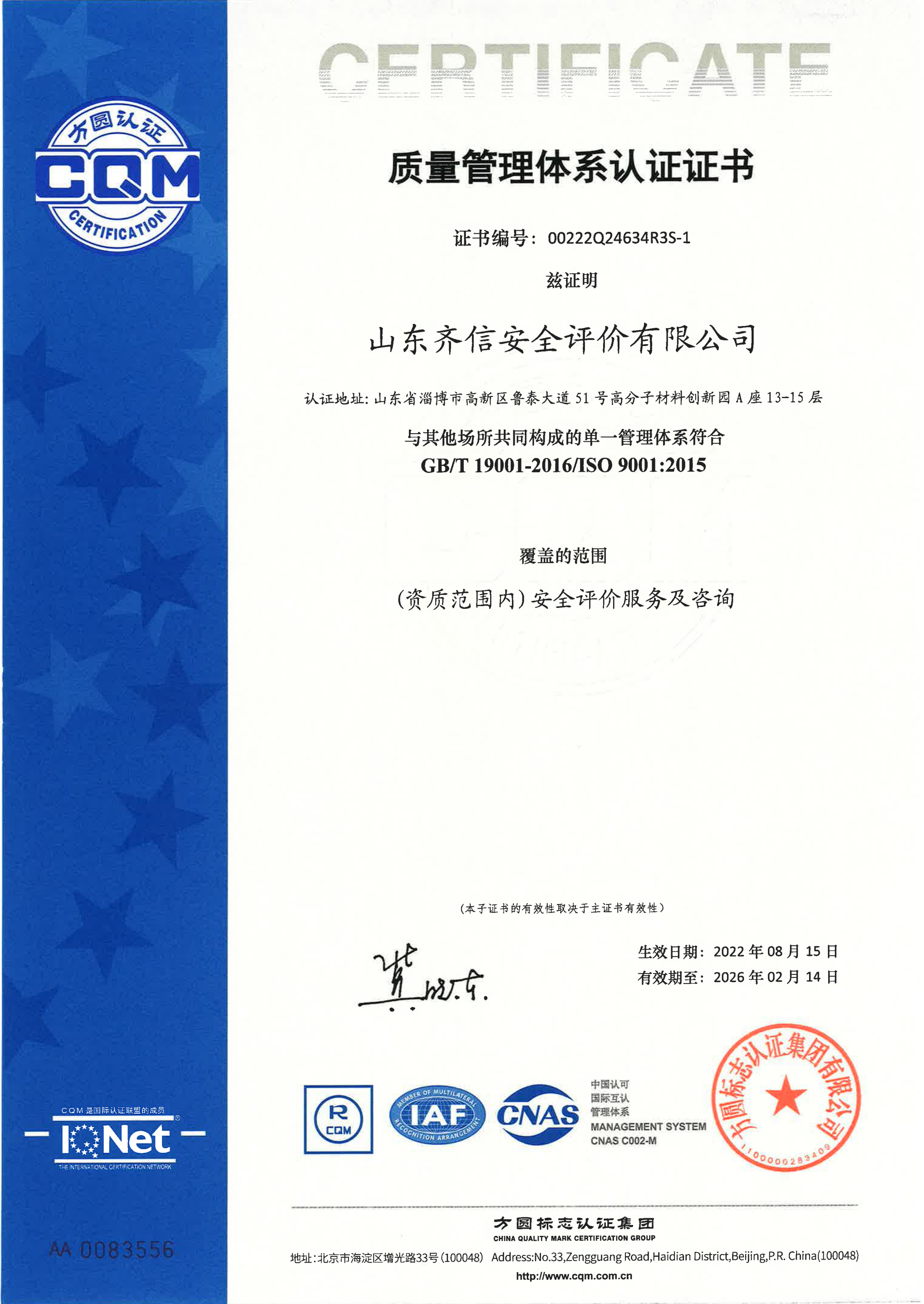 質量管理體系認證證書